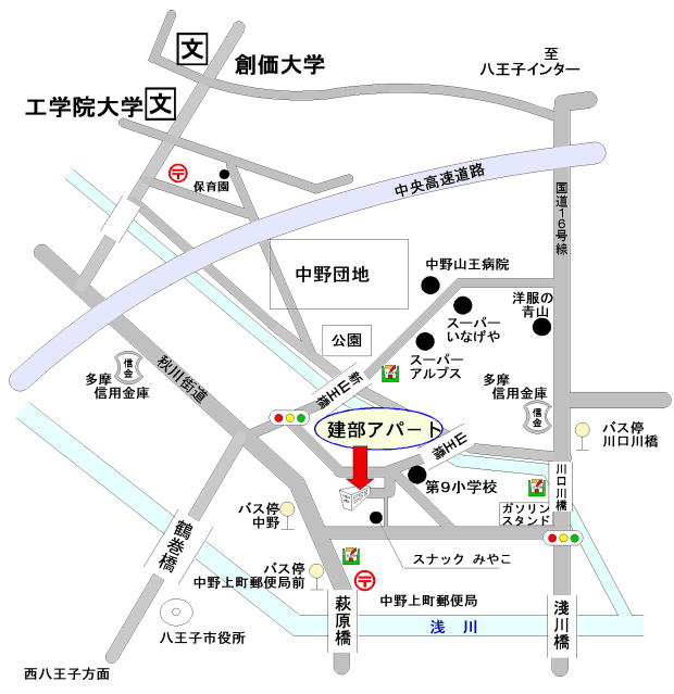 | ● JR八王子駅より、バス利用の場合、 バス乗り場Fよりバス15分、バス停:中野上町郵便局前下車、徒歩6分 ● JR八王子駅より、徒歩の場合は、約35分 ● JR西八王子駅より、徒歩の場合は、約29分 ● 自動車の場合、JR八王子駅より車で約15分 ● 自動車の場合、中央高速道路八王子インターより、車で約8分 |
